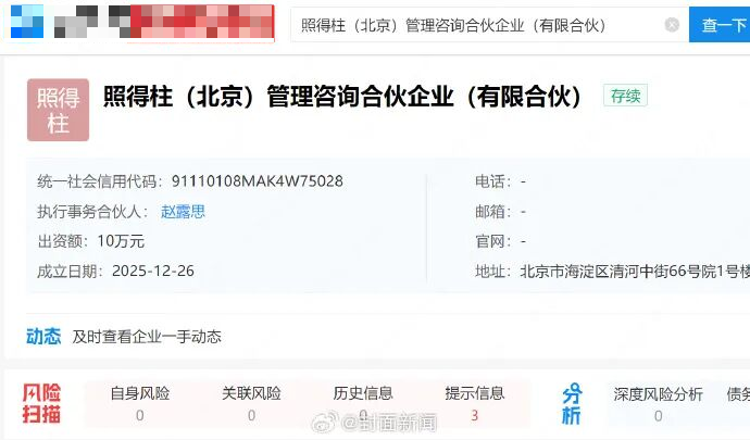 据媒体12月29日报道,近日,照得柱(北京)管理咨询合伙企业(有限合伙)成立,执行事务合伙人赵露思,出资额10万元,经营范围包含企业管理、专业设计服务、组织文化艺术交流活动等,由北京负负得赵企业管理有限公司和赵露思分别持股99%、1%,前者由赵军持股90%。