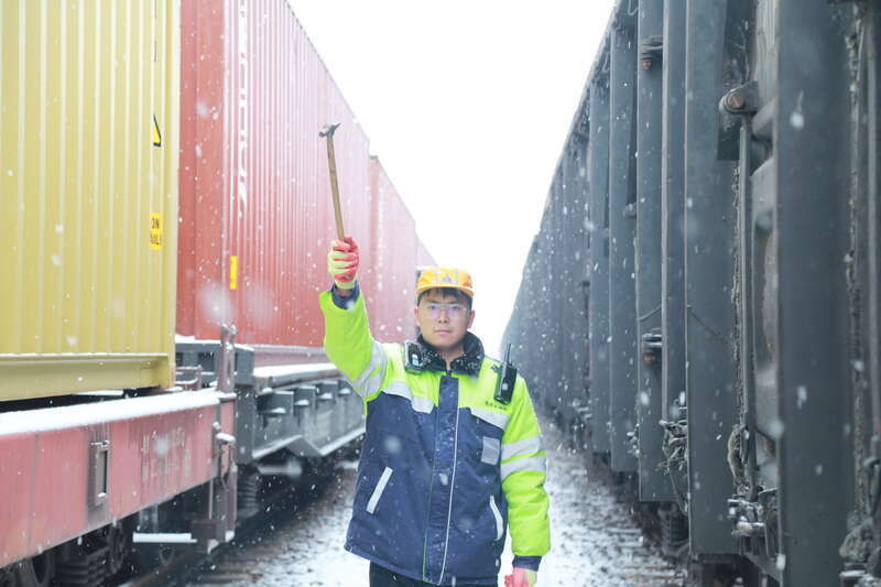 1月19日,河南、山西多地迎来降雪,为应对大范围降雪,中国铁路郑州局集团焦作车辆段迅速启动应急预案,现场检车员加大对车辆走行部、车钩缓冲装置等关键部位检查力度,对关键设备状态逐一确认,全面消除安全隐患,确保恶劣天气下行车安全和人身安全。图为1月19日该段现场检车员正在传递号志的场景。宋子文/摄