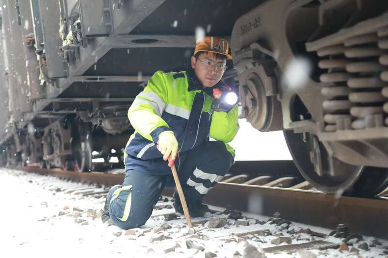 1月19日,河南、山西多地迎来降雪,为应对大范围降雪,中国铁路郑州局集团焦作车辆段迅速启动应急预案,现场检车员加大对车辆走行部、车钩缓冲装置等关键部位检查力度,对关键设备状态逐一确认,全面消除安全隐患,确保恶劣天气下行车安全和人身安全。图为1月19日该段检车员正在冒雪作业的场景。宋子文/摄